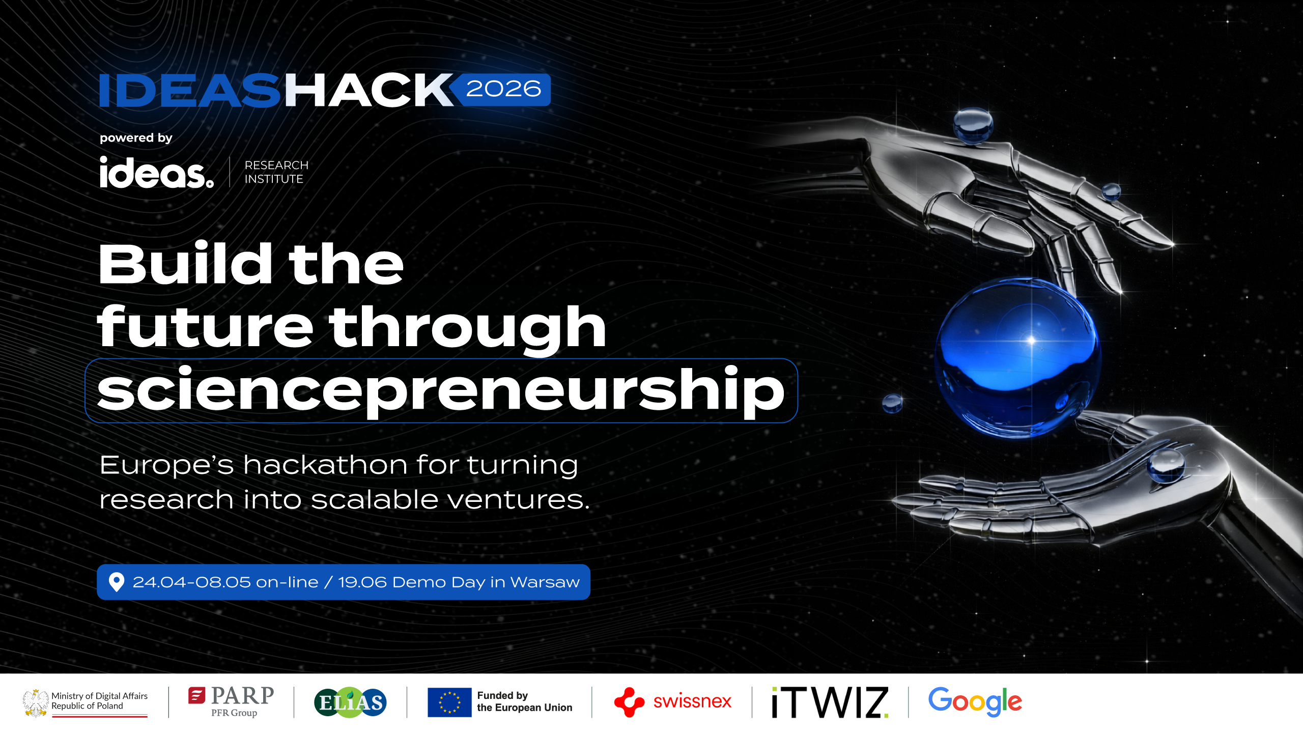 IDEAHACK is the first hackathon organized by IDEAS NCBR under the European Lighthouse of AI for Sustainability (ELIAS) project. The mission of this event is to create a dynamic platform where business-minded individuals and scientists can connect, exchange ideas, and collaborate on solutions to real-world challenges. The focus is particularly on Artificial Intelligence (AI), with the aim of bridging the gap between science and entrepreneurship.